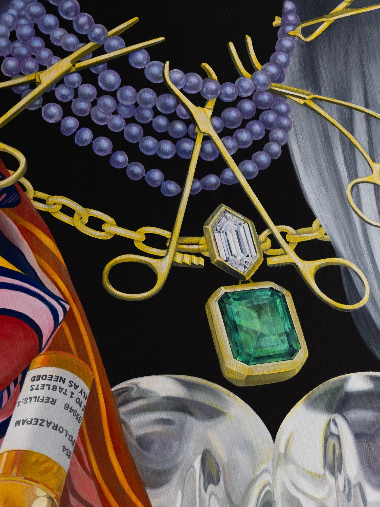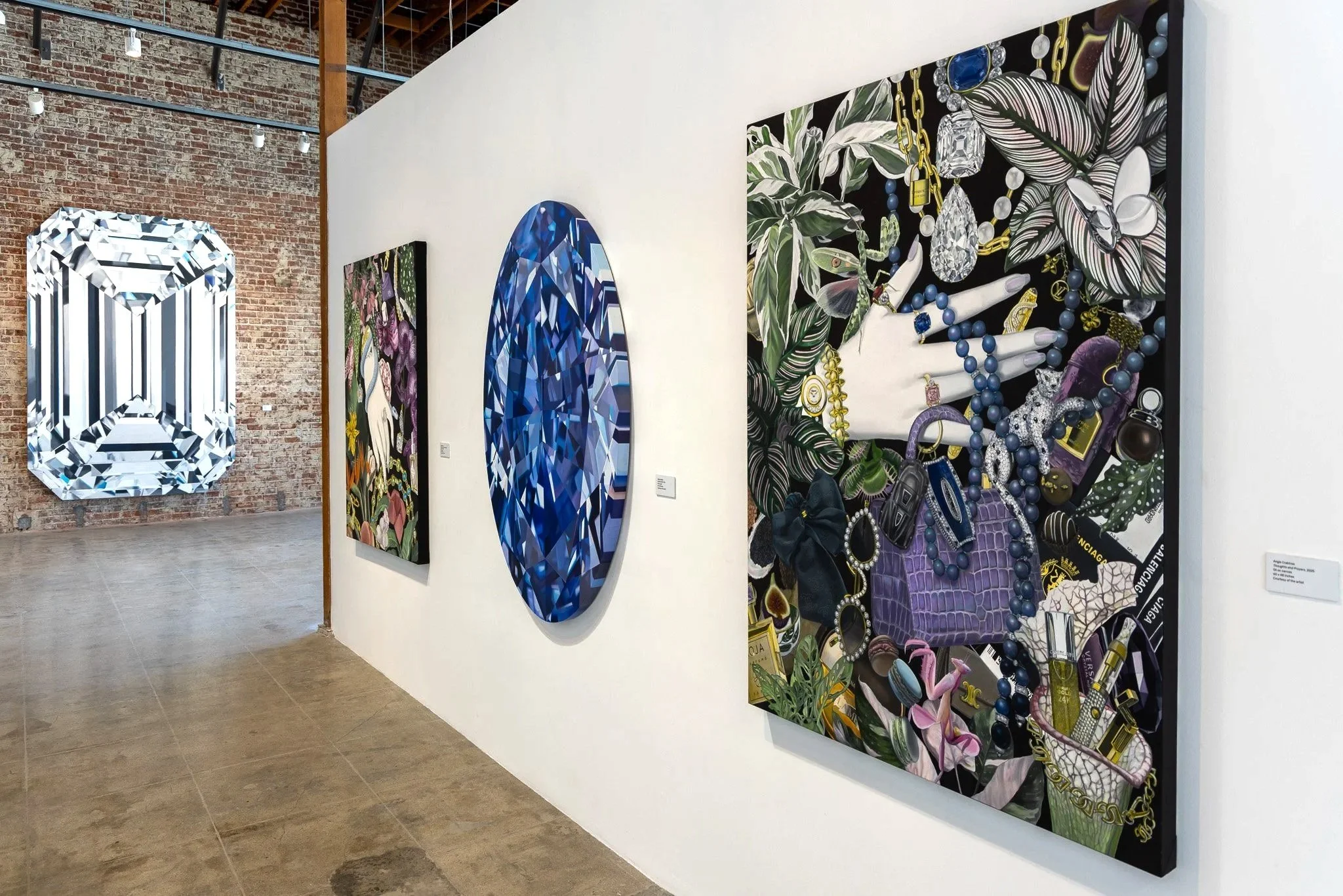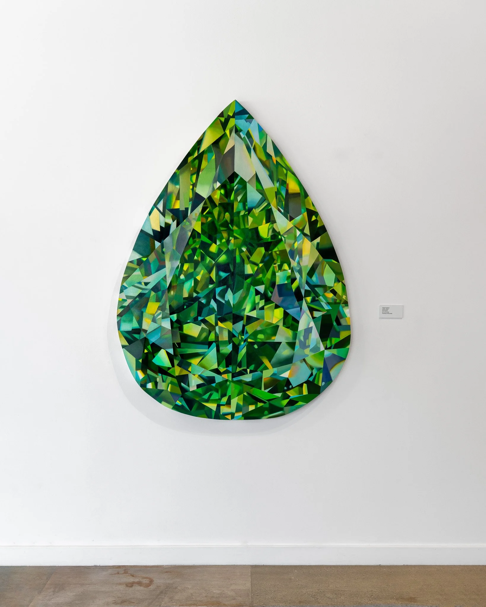 Angie Crabtree’s paintings dissect the mythology of luxury. Diamonds became her first muse—the commodification of nature, the way raw beauty is captured, fixed, and displayed as proof of success. Their natural forms once buried deep beneath the earth, now mined, cut, and polished into representations of what’s impossibly valuable. By enlarging them to monumental scale she invites viewers to consider the origins of the stones, their societal significance and reconsider their true value.